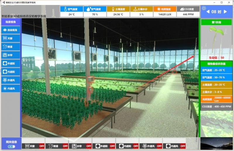 在平臺的右側(cè),虛擬了一個植物,上方點擊按鈕可以調(diào)整時間的流逝,植物會根據(jù)時間流逝進行生長,生長過程中植物對環(huán)境的需求會產(chǎn)生變化。學(xué)生可以先了解植物生長的需求,然后根據(jù)植物的需求來編寫上位機控制程序,通過上位機程序?qū)υO(shè)備的控制來改變大棚內(nèi)的環(huán)境參數(shù),達到植物生長的最佳環(huán)境。